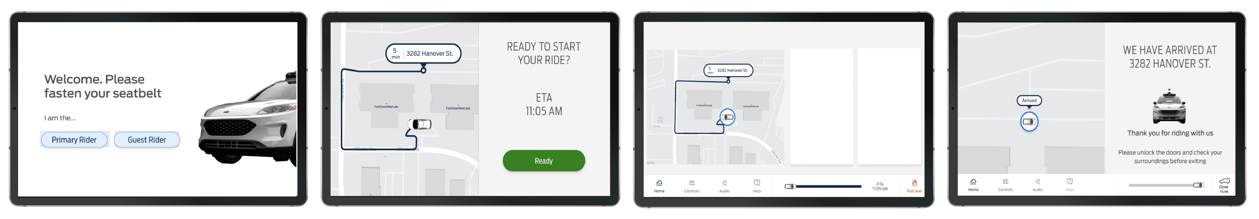 Using the flows, I created screens for in-vehicle and mobile testing devices using Figma, and prototyping in Framer. We used a Welcome screen, a “Ready to start”, an in-ride screen, and an Arrival screen. We purposely kept the screens vague with the information because we wanted to see what users would want to see within the screens.
