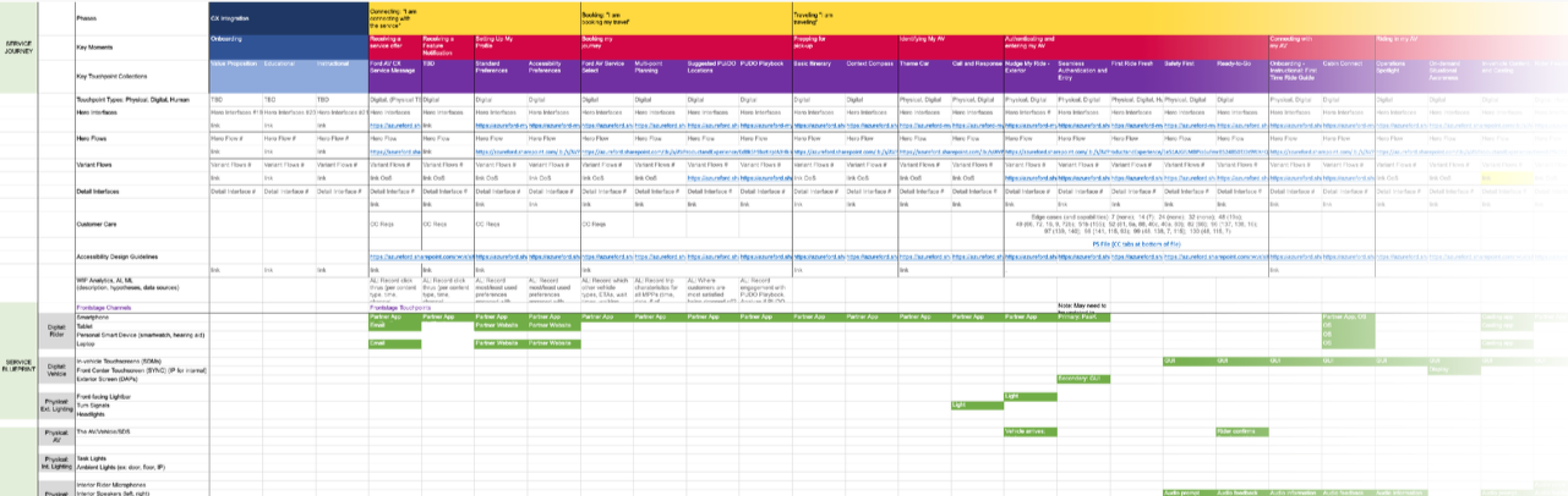 After gathering our research we had to work with engineers, data scientists, and project managers to get everyone on board for the vision. To do this we started by listing all of the possible devices, sounds, and interactions that would be used as a different color. In the next step, we would produce the ideal flow and then we would review the flows with the product teams and engineers. This involved some heated discussions with many engineers who were not used to self-driving technology, so it was a good point of education to learn more from them as well as, teaching them about self-driving technology. We called the flows that represented the most popular interaction, the hero flow. To accamodate all of the possible interactions, we realized we also had to create variant flows for the specific use cases that were not represented in the hero flow.