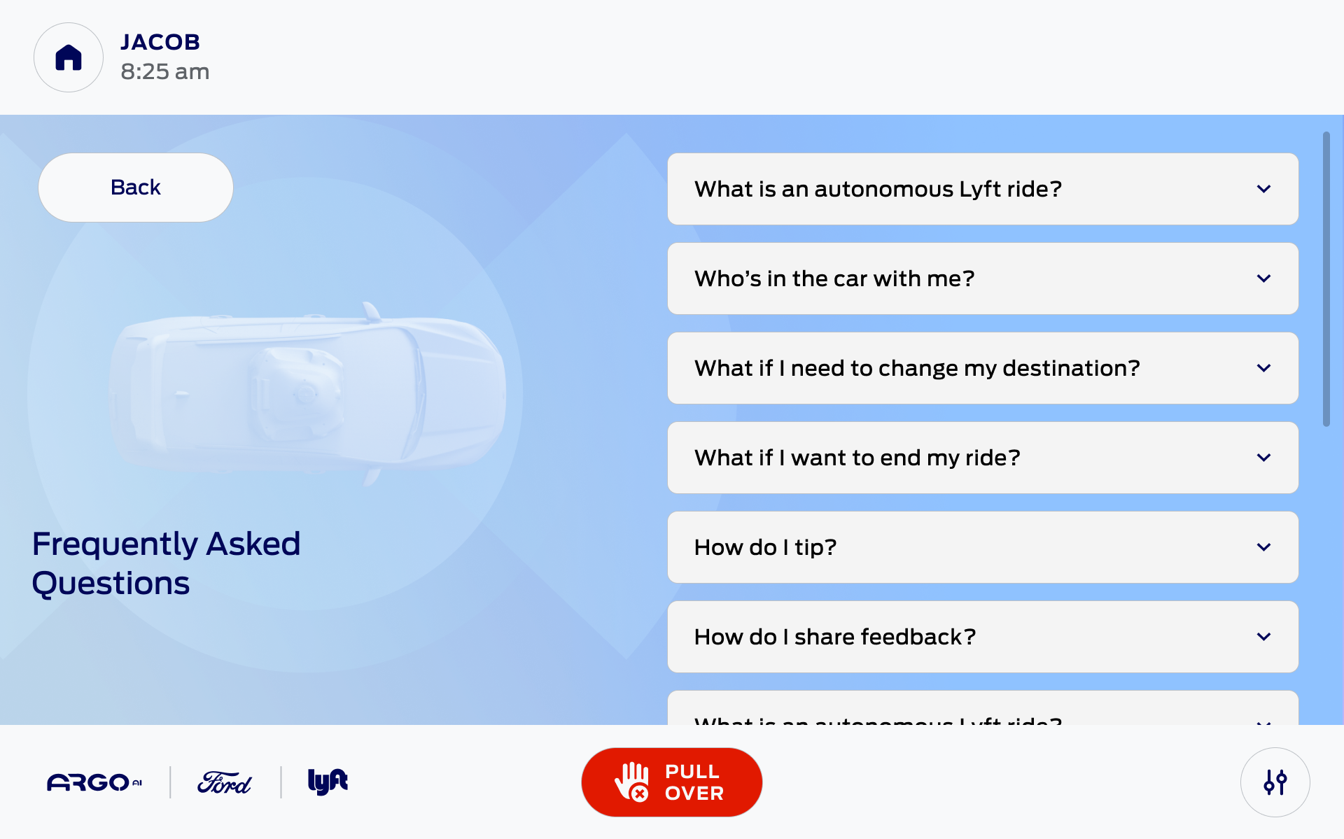 The users talked about wanting to see a more of an “In Progress” screen that would help users track where they are in relation to the street. Also users talked about wanting to know more about the autonomous vehicle driving system, so we were able to add